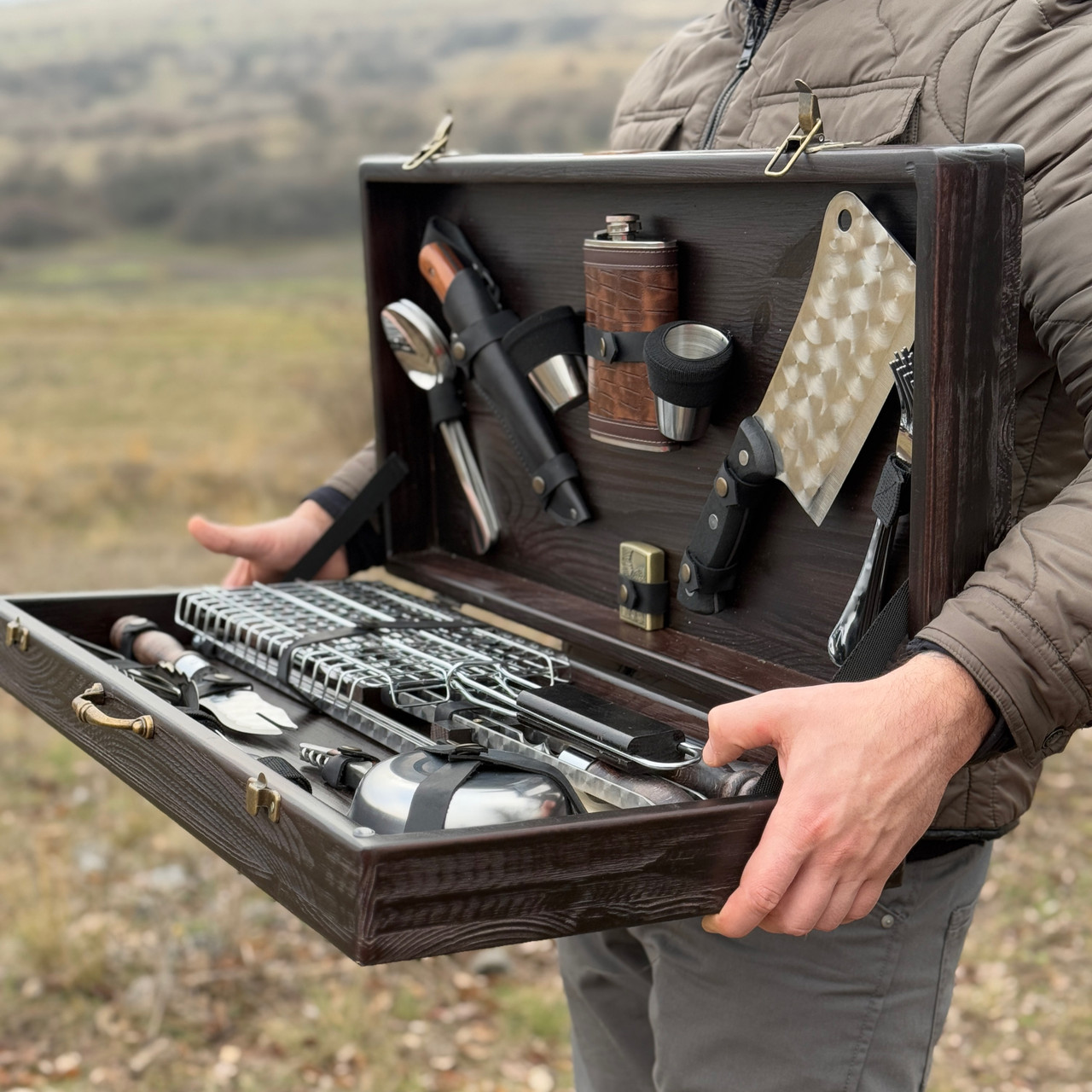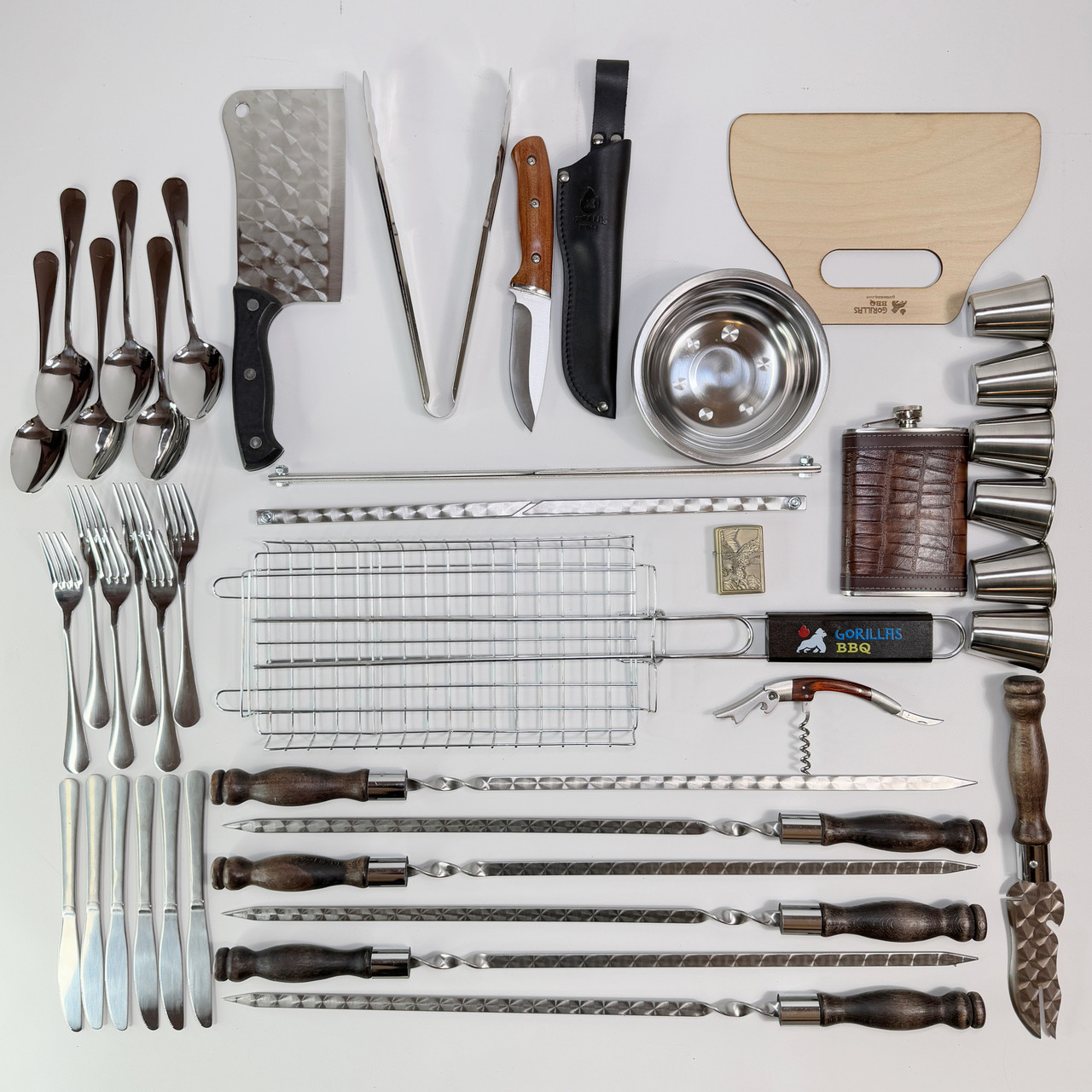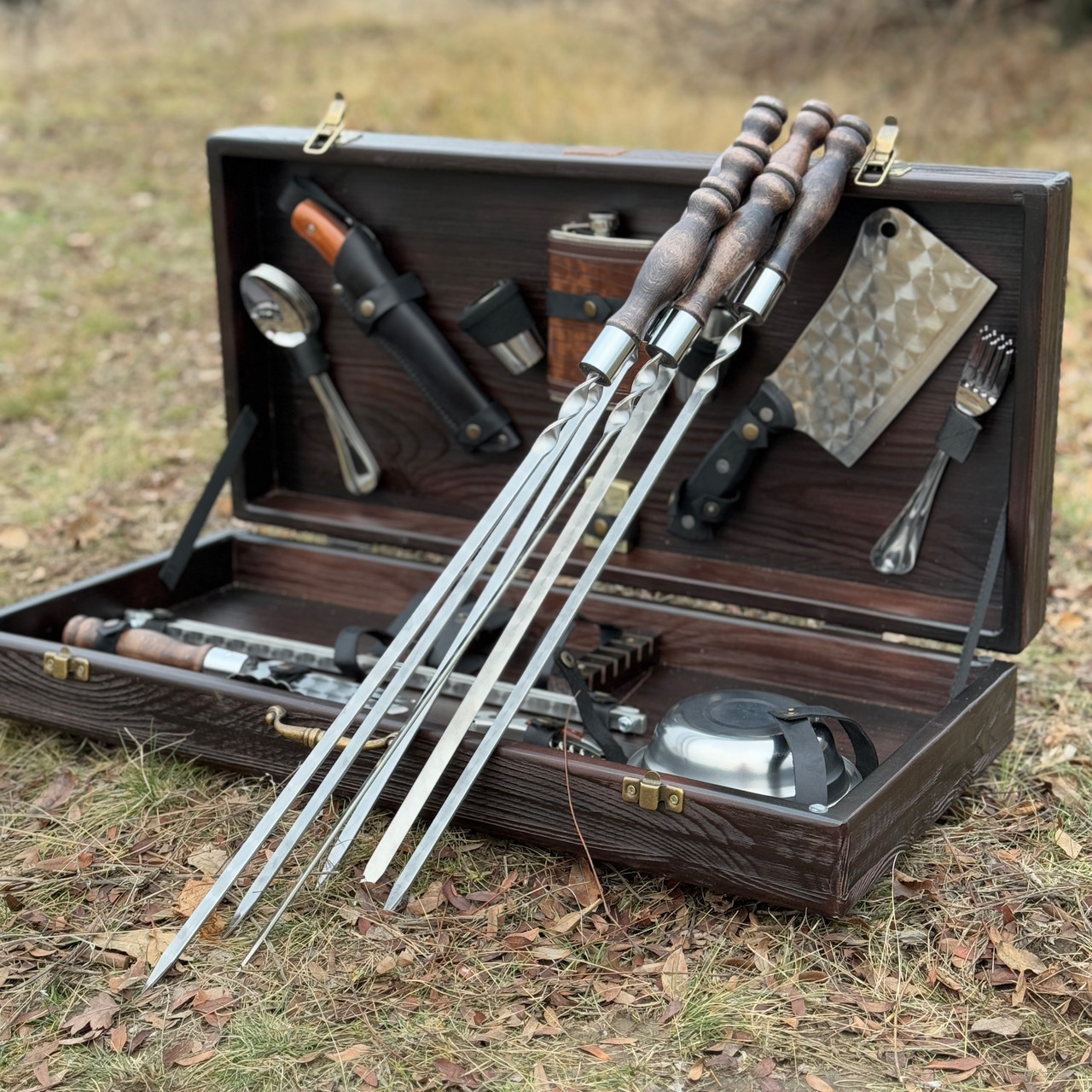 Набір шампурів складається із 45 предметів. Все необхідне для комфортного відпочинку на природі для компанії з 6 осіб. Тепер не потрібно довго збиратися на природу, просто візьміть набір і те, що збираєтеся готувати. Набір так само стане оригінальним подарунком, навіть для людини у якого "вже все є". А наша додаткова опція "іменне гравіювання", стане "вишнею на торті", яка зробить подарунок ще більш ексклюзивним і незабутнім!