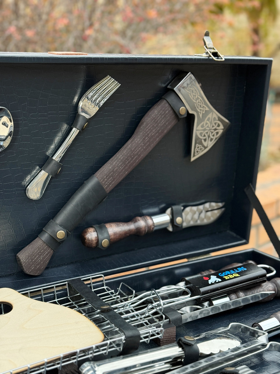 Набір складається з 43 предметів. Усе найнеобхідніше для приготування різних страв на багатті. Такий набір так само стане чудовим подарунком для ваших рідних, близьких, друзів або колег по роботі. А додаткова опція "іменне гравіювання" стане "вишенькою на торті", яка зробить ваш подарунок ще оригінальнішим і незабутнішим.